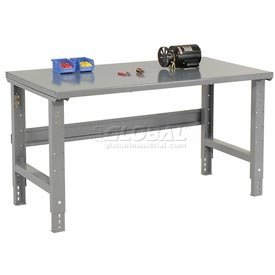 Steel Top Workbench 12 gauge steel top reinforced with 14 gauge end channels for superior strength and durability. Baked enamel finish will not absorb oil and resists rust and cracks. 1-3/4" thick. Front and back of adjustable legs feature removable duplex knockouts for installation of either a hard wired electrical outlet or an optional plug-in outlet that easily screws into place with no wiring necessary.