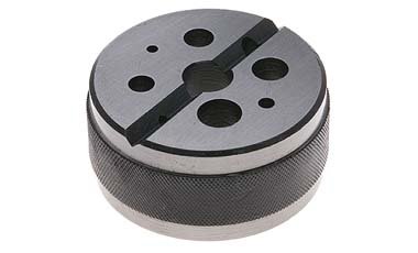 For holding work when driving pins, drilling, etc. V-groove for holding round or odd-shaped work. Hardened & ground with a smooth finish. 3" diameter, 1 1/2" height. Holes vary in size from 1/8-5/8".