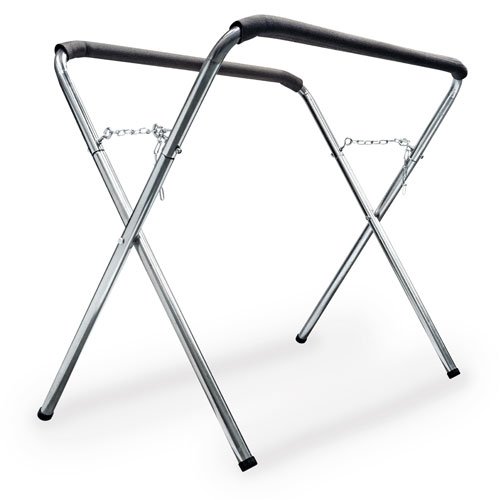 Work with ease on fenders, doors, hoods and more. This portable bench is easy to set up. Sturdy tubular steel frame adjusts for height and width. Thick 3/8" foam rubber padding protects painted parts from scratching. Complete with non-skid feet.This stand is approximately 42" tall and 41" wide with 11" chain for height adjustment.