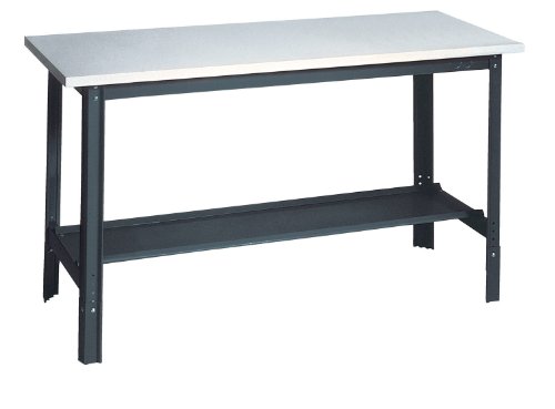 Supported on all 4 sides by an all steel frame. Full 12" deep lower shelf included. 1-piece heavy gauge steel legs all electrically welded. Double electrical knockouts in legs front and back. Straight leg design adjusts from 29" to 34" high in 1" increments. Strong thick flake board top that supports well over 200 pounds per square foot. Recommended for manufacturing plants repair shops schools garages and home workshops. Laminated 1" gray scrim plastic top resists mars burns and stains. Widely used in electronics industrial plants laboratories hospitals schools and scientific and government facilities. 1-1/4" Laminated plastic shelf material.